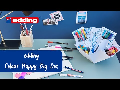 Die Colour Happy Big Box steht für Kreativität auf edding-Art: 69 perfekt abgestimmte Stifte und der Pinselstift Colour-Mixer für tolles Handlettering, weiches Ausmalen und jede Art von farbenfroher Kreativität auf Papier. 6 unterschiedliche Arten von Spitzen und Strichbreiten in vielen verschiedenen und harmonischen Farben, einschließlich weiß, Metallic-Farben, silber und gold. Für Fasermaler e-1300, e-1340 und e-1500 sowie Fineliner e-55: Die Tinte auf Wasserbasis schlägt nicht durch Papier durch. Der neue Pinselstift Colour-Mixer ermöglicht einfache, aber effektive Schattierungstechniken: Kreiere bis zu 190 Farbverläufe mit nur 20 Pinselstiften. Der neue Pastellstift sorgt für semi-transparente Weißschattierungen und kreiert wunderschöne Schattierungen in Pastellfarben in Kombination mit edding Fasermalern.